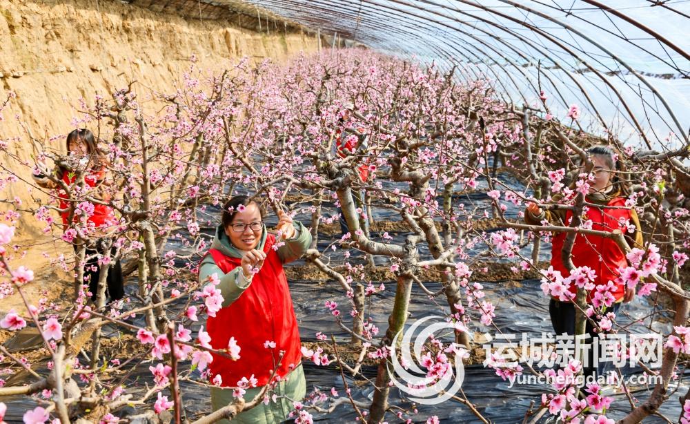 1月29日,夏县南大里乡党员志愿者在该县郭牛村的毛桃大棚里帮助果农疏花。