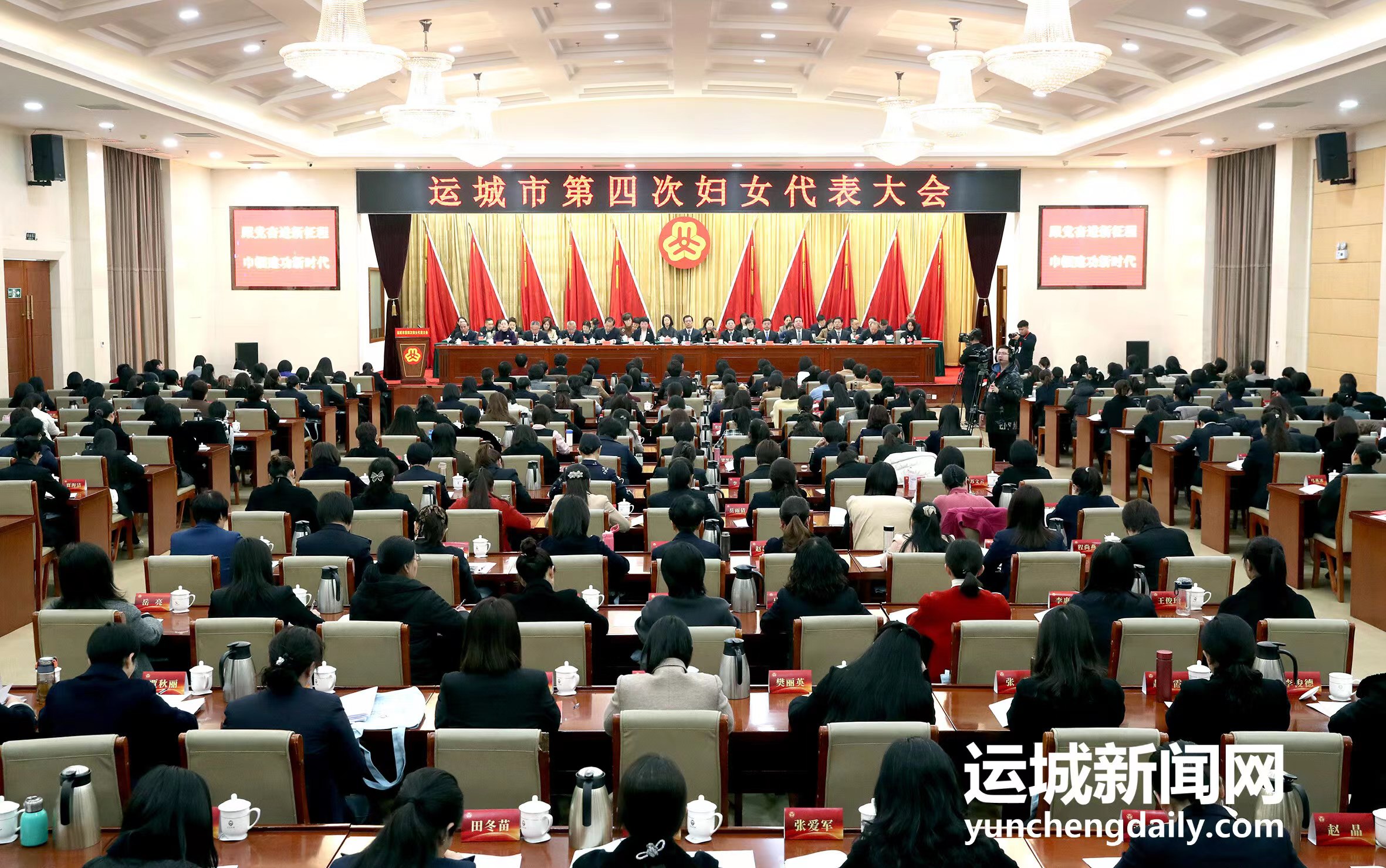 会场气氛庄重热烈。主席台上方悬挂着“运城市第四次妇女代表大会”会标,后幕正中是鲜艳的中华全国妇女联合会会徽,10面红旗分列两侧。会场后方悬挂着“跟党奋进新征程 巾帼建功新时代 动员引领广大妇女为谱写中国式现代化运城篇章而团结奋斗”大幅标语。