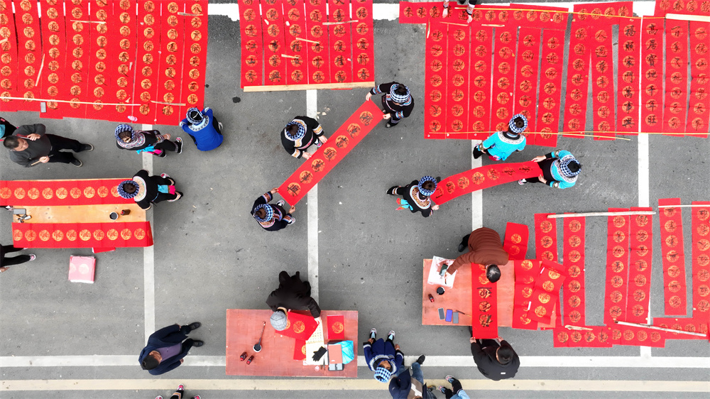 2月1日,书法爱好者在贵州省黔南布依族苗族自治州罗甸县红水河镇红河村为搬迁群众义务写春联。春节临近,红河村群众打糍粑、贴春联、挂红灯笼,喜迎农历新年。新华社记者 杨 楹 摄