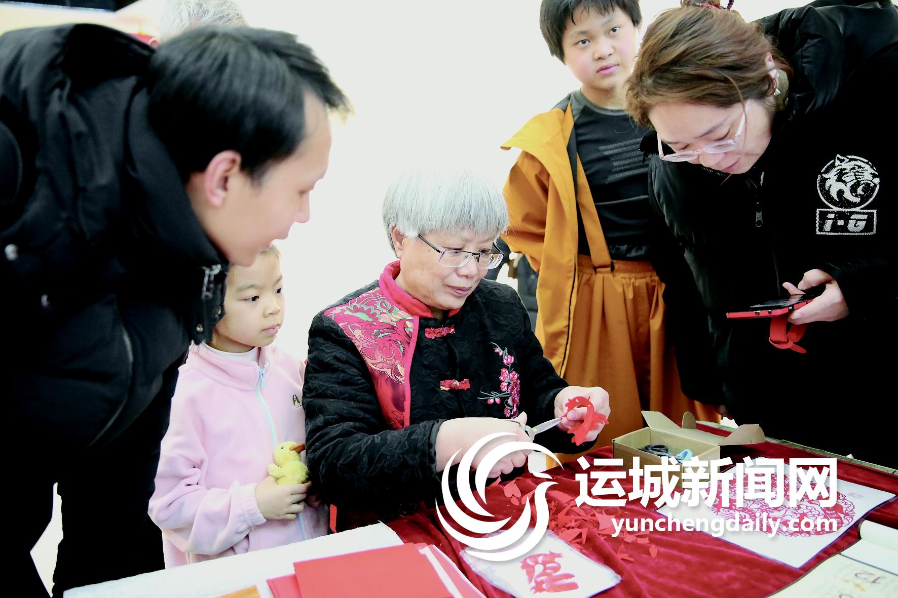 “我在河东过大年”,除了春联和“福”字,还得有别致的窗花。这不,主办方邀请到了运城市剪纸协会副会长李惠芳。只见李老师灵活运剪、动作流畅,不一会儿,惟妙惟肖的祥龙、吉祥如意的窗花,就呈现在众人面前。更有好学的小朋友还学起了剪纸。他们在李老师的指导下,很快就创作出了自己的作品。