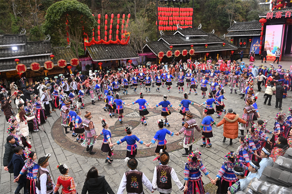 3日,正值南方小年,广西三江侗寨群众舂糍粑、打油茶、炸油果,聚在风雨桥、鼓楼坪和戏台,表演自编自导文艺节目,让游客们沉浸式体验三江侗族春节民俗和群众文化活动。