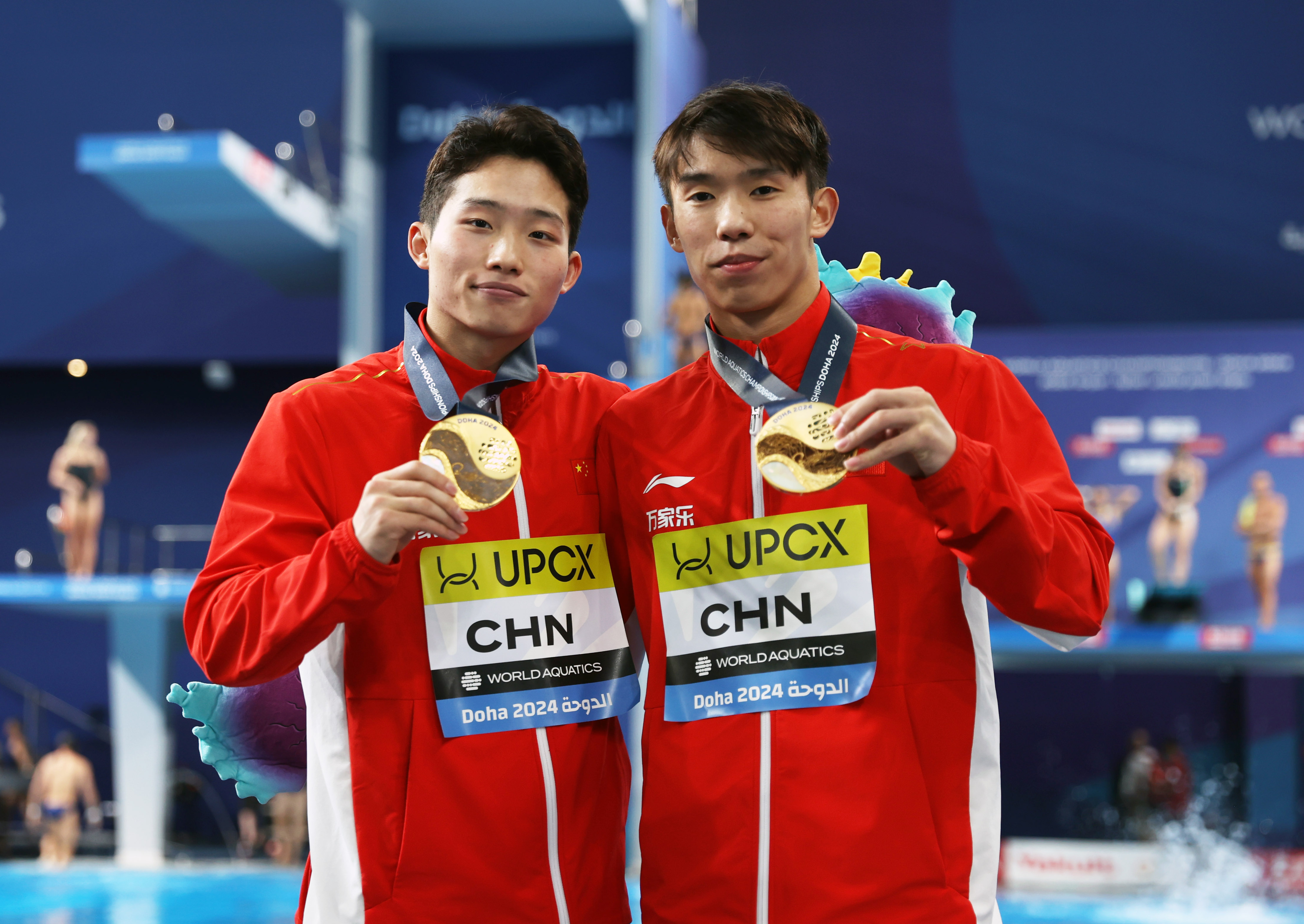 2月4日,王宗源(左)/龙道一在颁奖仪式后合影。当日,在卡塔尔多哈举行的2024年世界游泳锦标赛跳水项目男子双人3米板决赛中,中国组合王宗源/龙道一以442.41分的成绩夺得冠军。 新华社记者 雒圆 摄