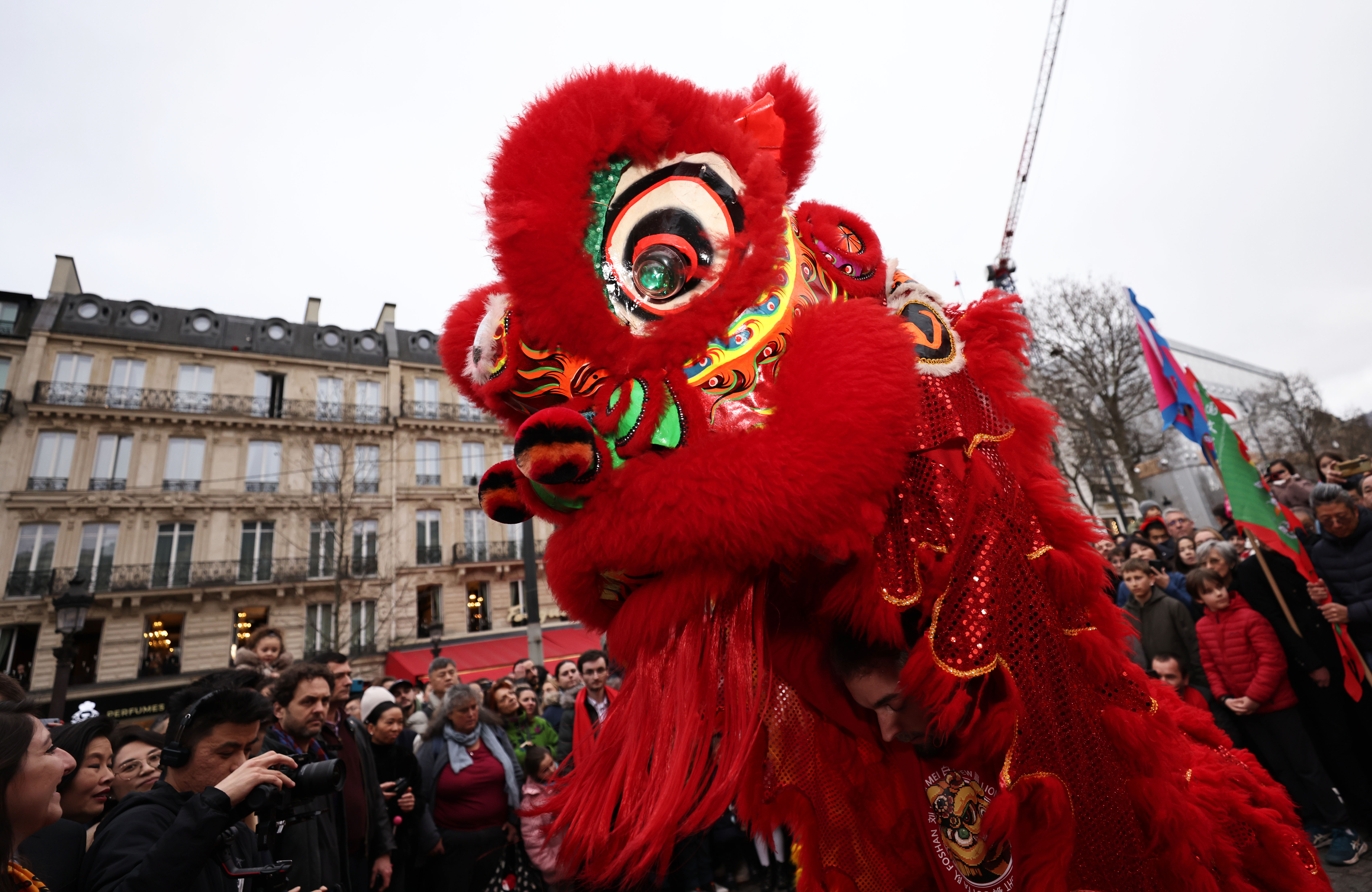 2月4日,人们在法国巴黎香榭丽舍大街观看舞龙舞狮表演。
