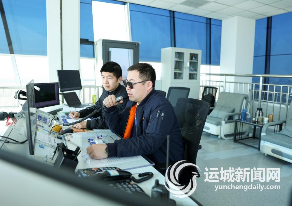 在芮城新南张机场塔台管制室,工作人员正在管制席位上,一边拿着话筒,一边盯着面前的屏幕,还不时看着窗外,冷静引导飞机有序起飞和降落。