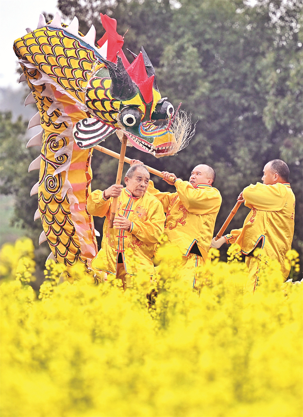 近日,罗德书(左一)与舞龙队成员一起舞龙。