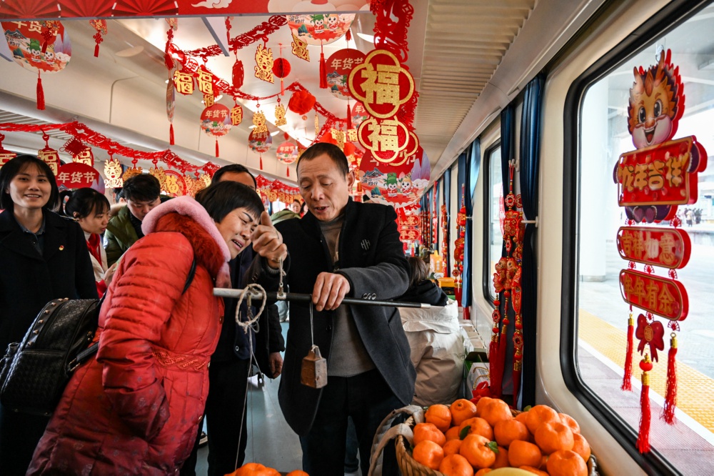 近期,中国铁路成都局集团有限公司联合重庆铁路公安处、贵州省桐梓县文化旅游局等部门,在遵义往返重庆西的5630/5629次列车上举办“年货集市”,旅客在列车上“逛年货”、品尝“年夜饭”、欣赏非遗文化表演,感受浓浓年味。