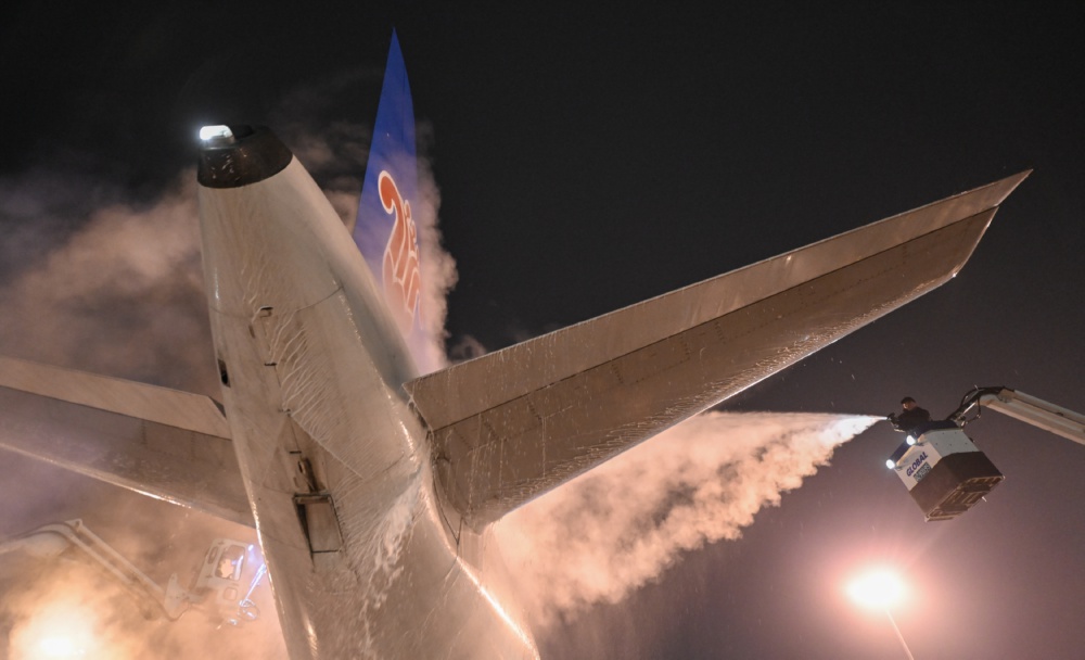 2月5日夜,工作人员对飞机进行除冰除雪作业。