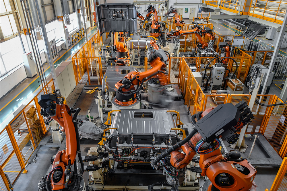 2月7日,在位于吉林长春的一汽解放汽车有限公司卡车厂焊装车间内,流水线上的机器人对零部件进行焊接作业。