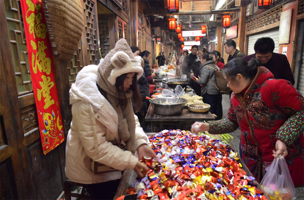2月7日,人们在湖北省宣恩县庆阳古街购买年货。