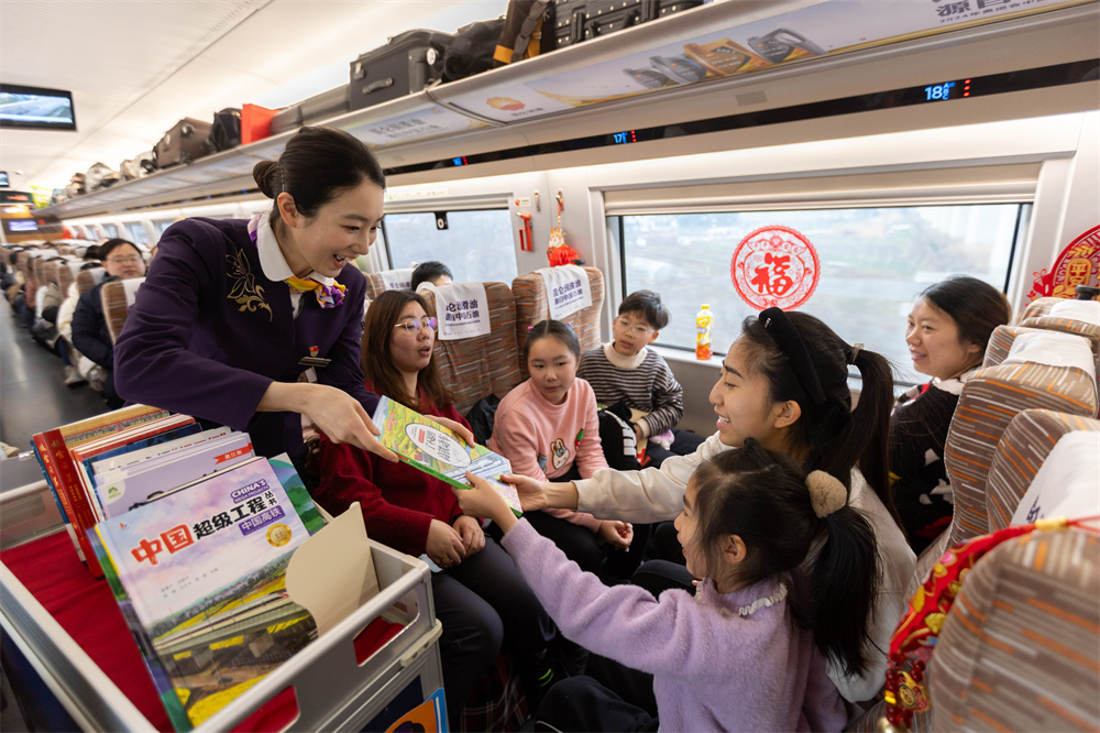春运期间,铁路上海客运段在各趟列车上增设阅读角和流动书屋,为儿童旅客出行增添乐趣。