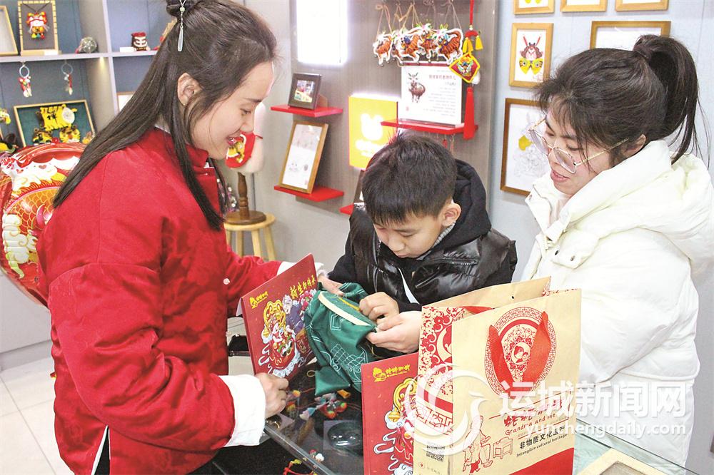 春节期间,在闻喜县涑水小镇的一家店铺里,一名来自贵州的小朋友在体验刺绣技艺。特约摄影 刘 佳 摄