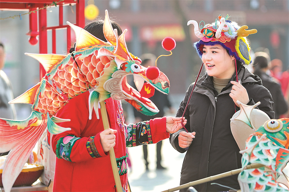 2月13日,游客在河南商丘古城年货大集上购买龙帽。 新华社发(李 恒 摄)