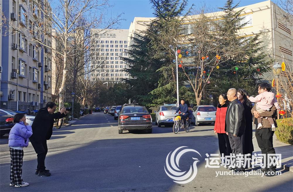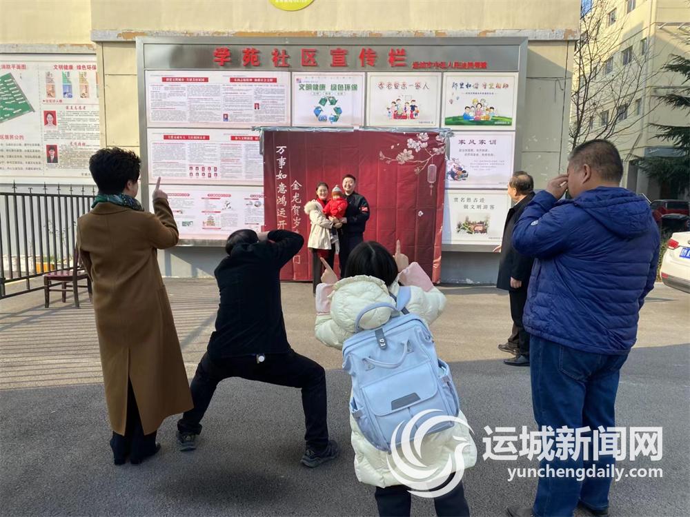 小区居民许阿姨和老公、女儿及外孙女在现场等候。许阿姨的女儿一家在杭州生活,因为疫情,三年没回运城。今年春节,许阿姨的女儿带着孩子回到运城过年,恰逢社区开展活动,一家四口高高兴兴照了张全家福。