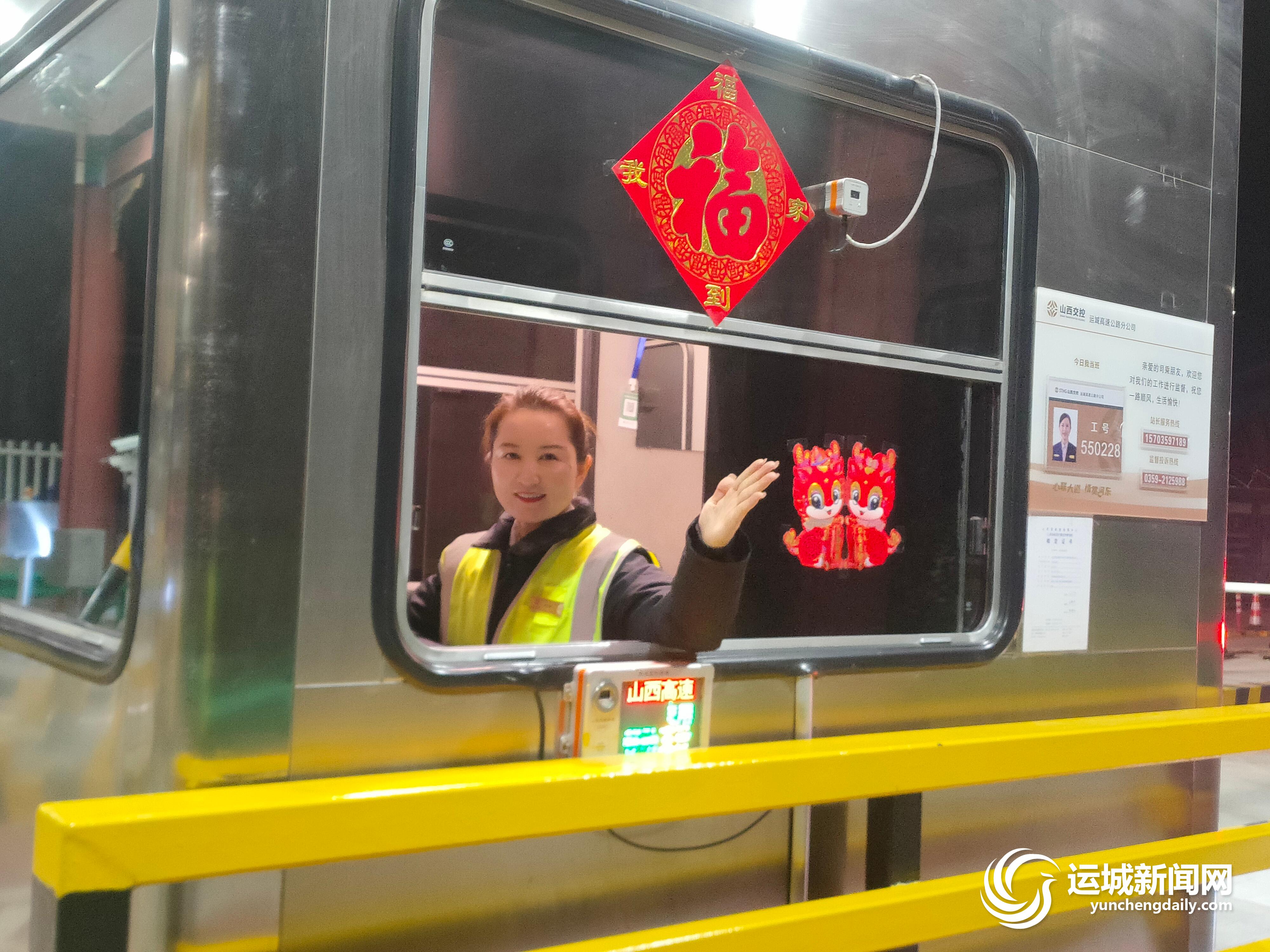 “新年好,祝您一路顺风。”2月18日,运城高速常平收费站收费员周爱琴值守在三尺岗亭里,脸上挂着甜美的笑容,配上标准的迎送手势,为过往的车辆一一送去新春祝福。