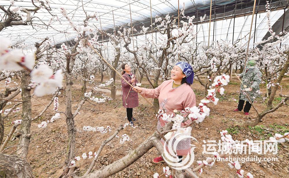 2月19日,在永济市韩阳镇陈村的早熟杏大棚内,果农在进行授粉作业。