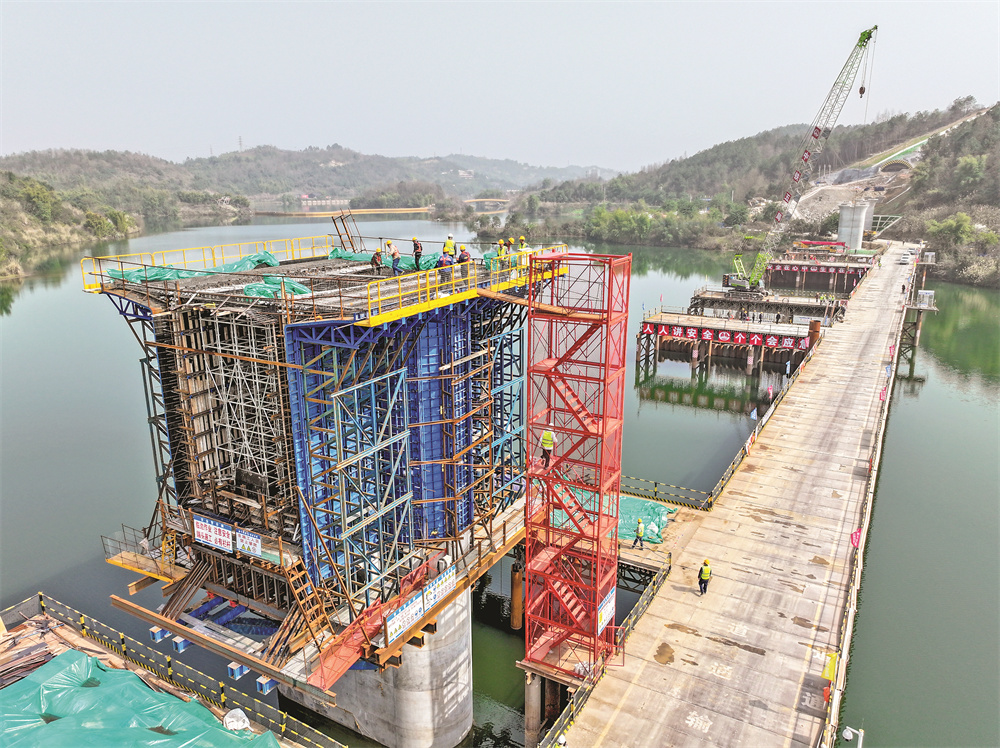 2月19日,在位于重庆市铜梁区的成渝中线高铁玄天湖大桥建设现场,工作人员在施工作业(无人机照片)。