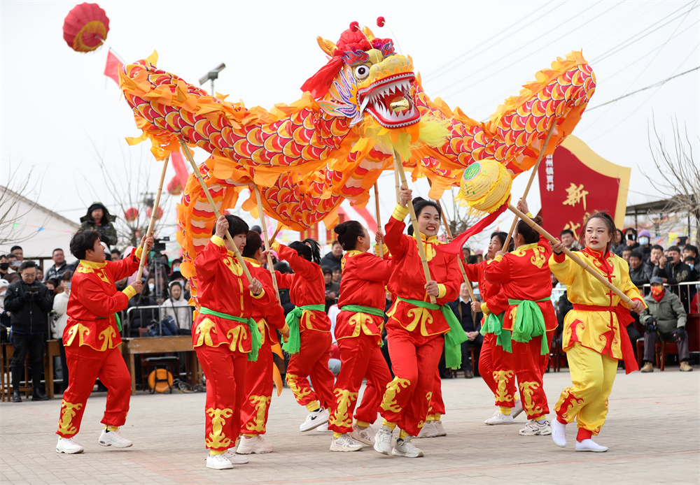 2月19日,在河北省沧县旧州镇贾村,演出队伍在表演舞龙。