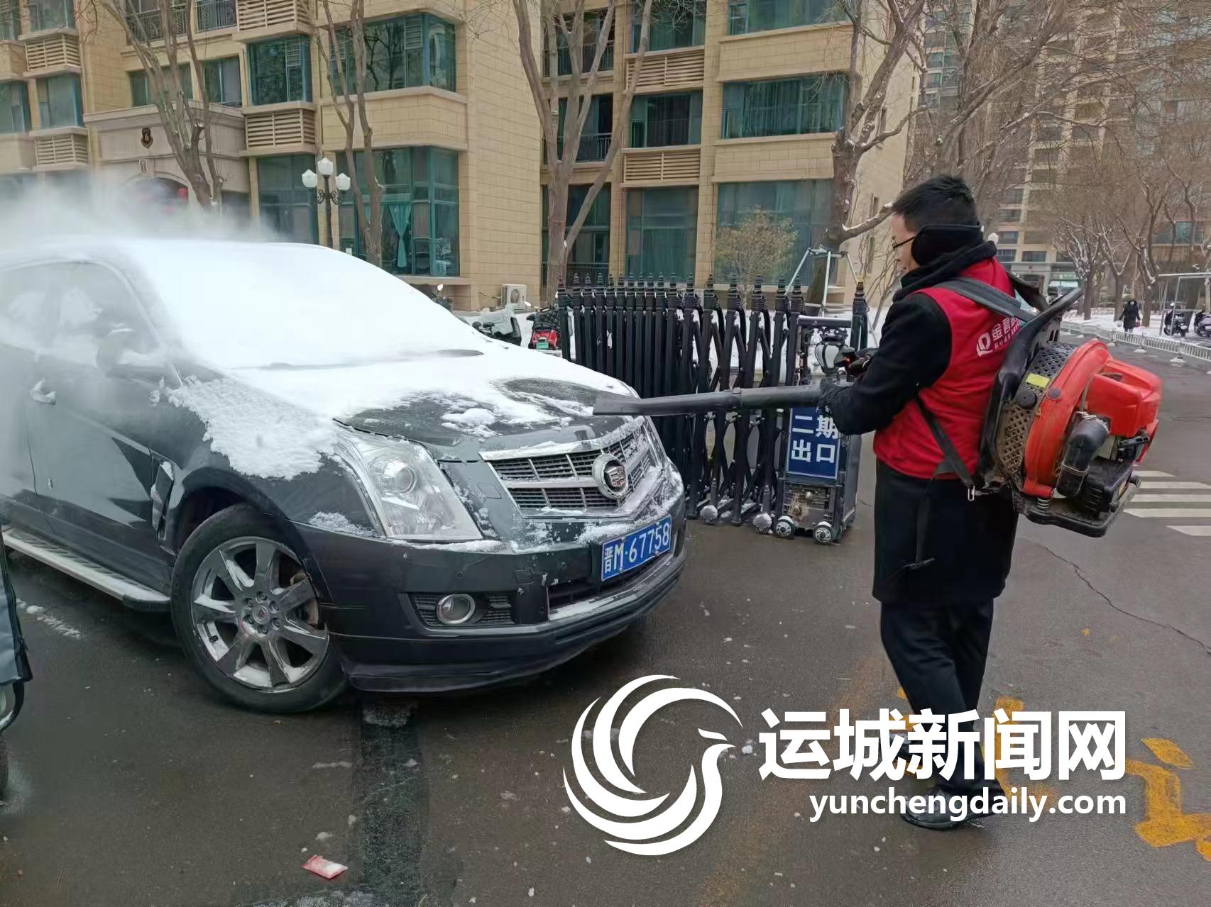 运城晚报讯(记者 崔萌)2月21日,盐湖区恒大绿洲小区物业人员身背鼓风机,为居民清理车上的积雪(上图)。
