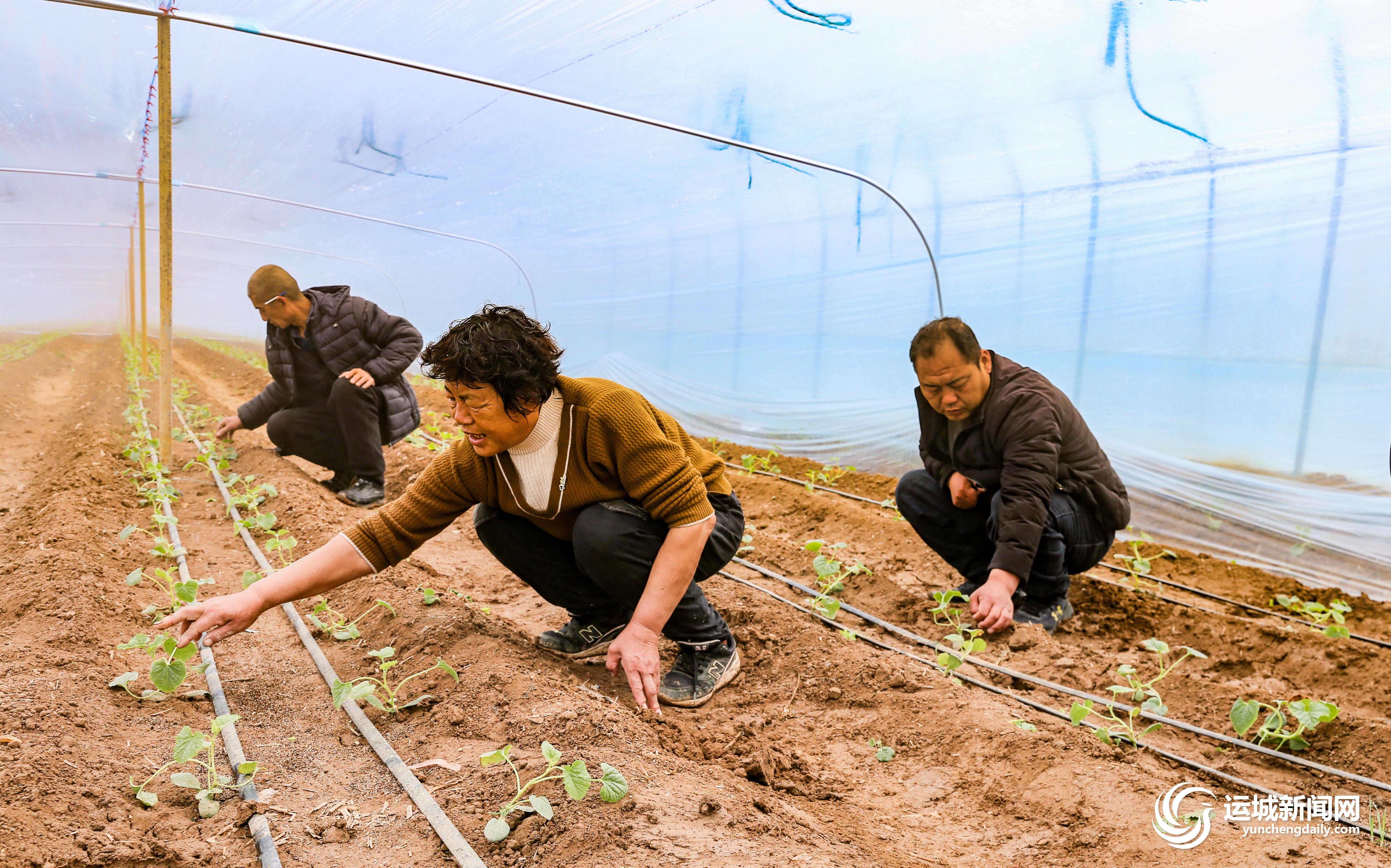2月22日,夏县水头镇东张村集体兴建的高标准设施大棚里,村民在对新栽的甜瓜秧苗进行精心管护。