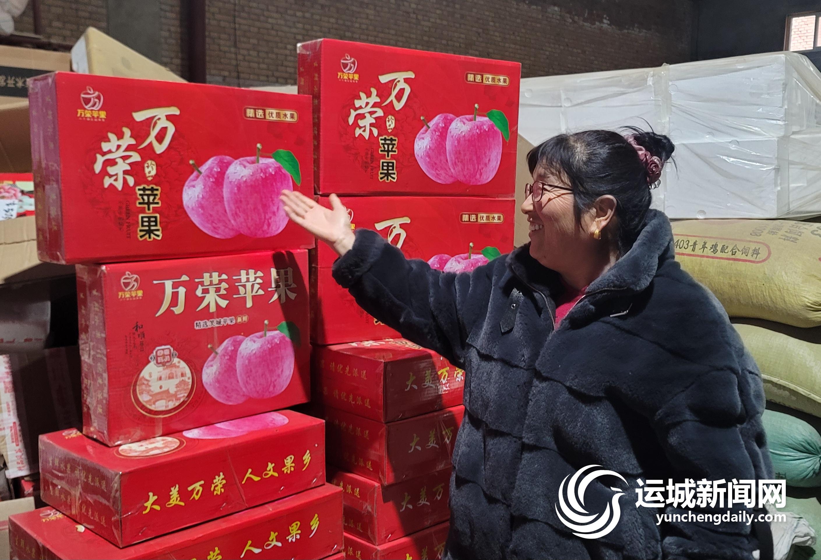 李青青介绍仓库里即将发货的万荣苹果