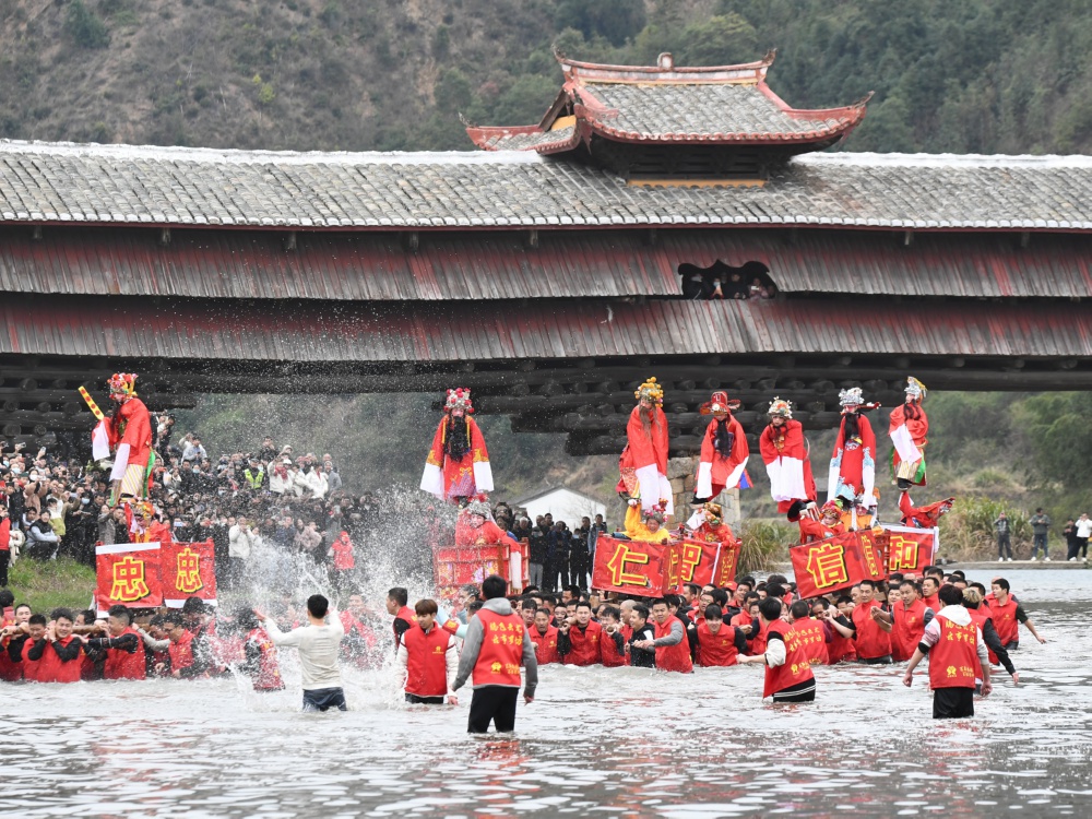 2月24日,福建省连城县罗坊乡走古事队伍穿过云龙廊桥,蹚着清岩河水前行。