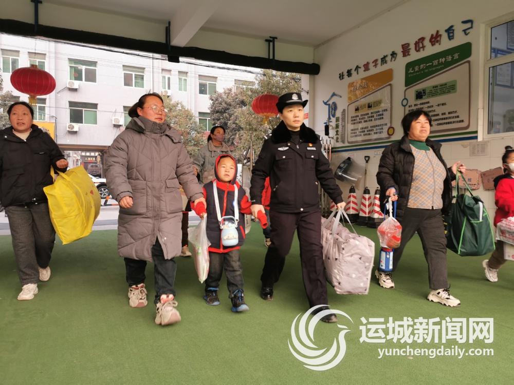 2月26日,春季开学首日,芮城县公安局民警与家长一起把小朋友安全送进校园。 王鹏飞 摄