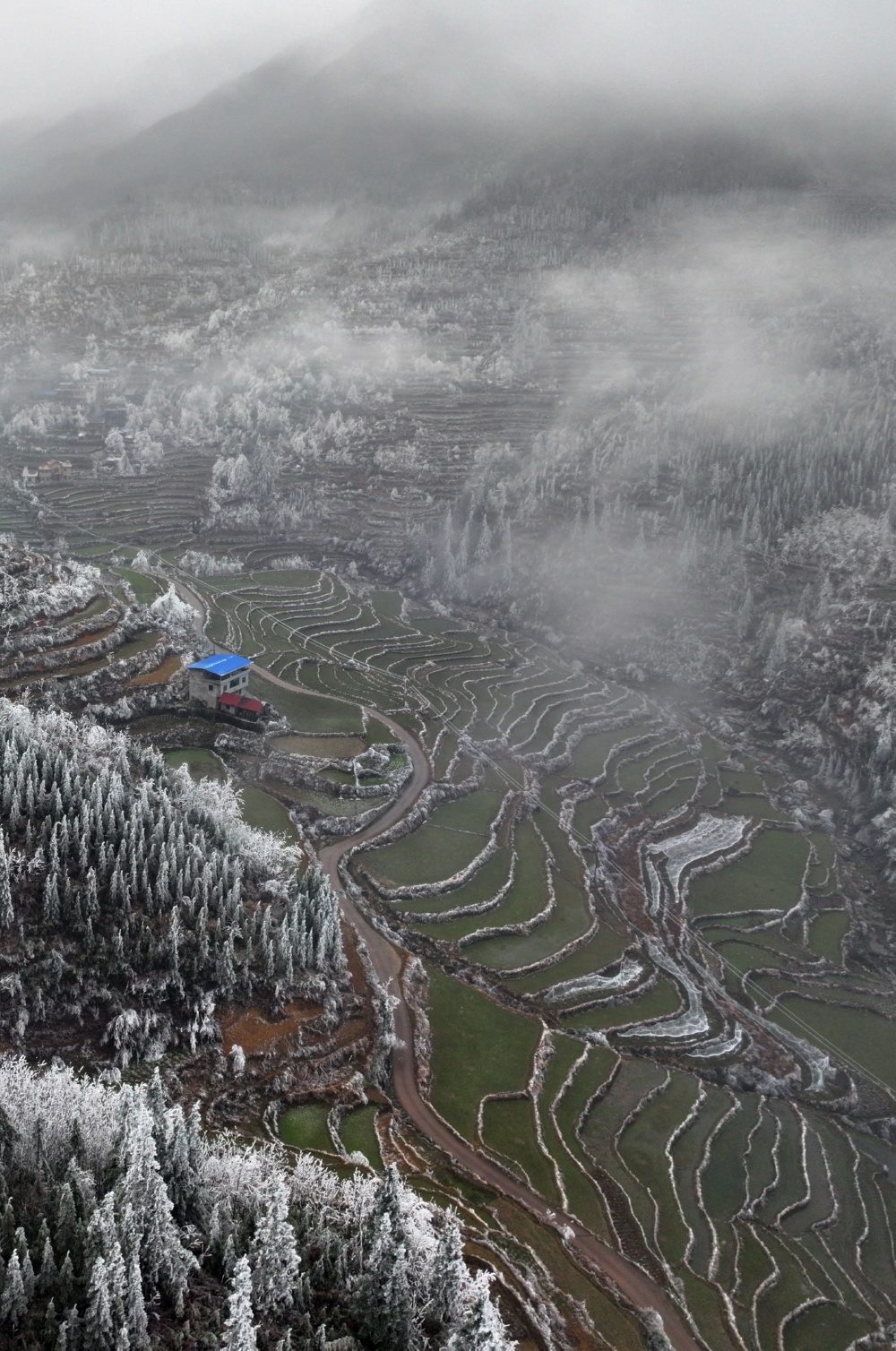 连日来,受强冷空气影响,广西桂林市全州县蕉江瑶族乡持续冰雪天气,瑶寨梯田被冰雪覆盖,美如画卷。