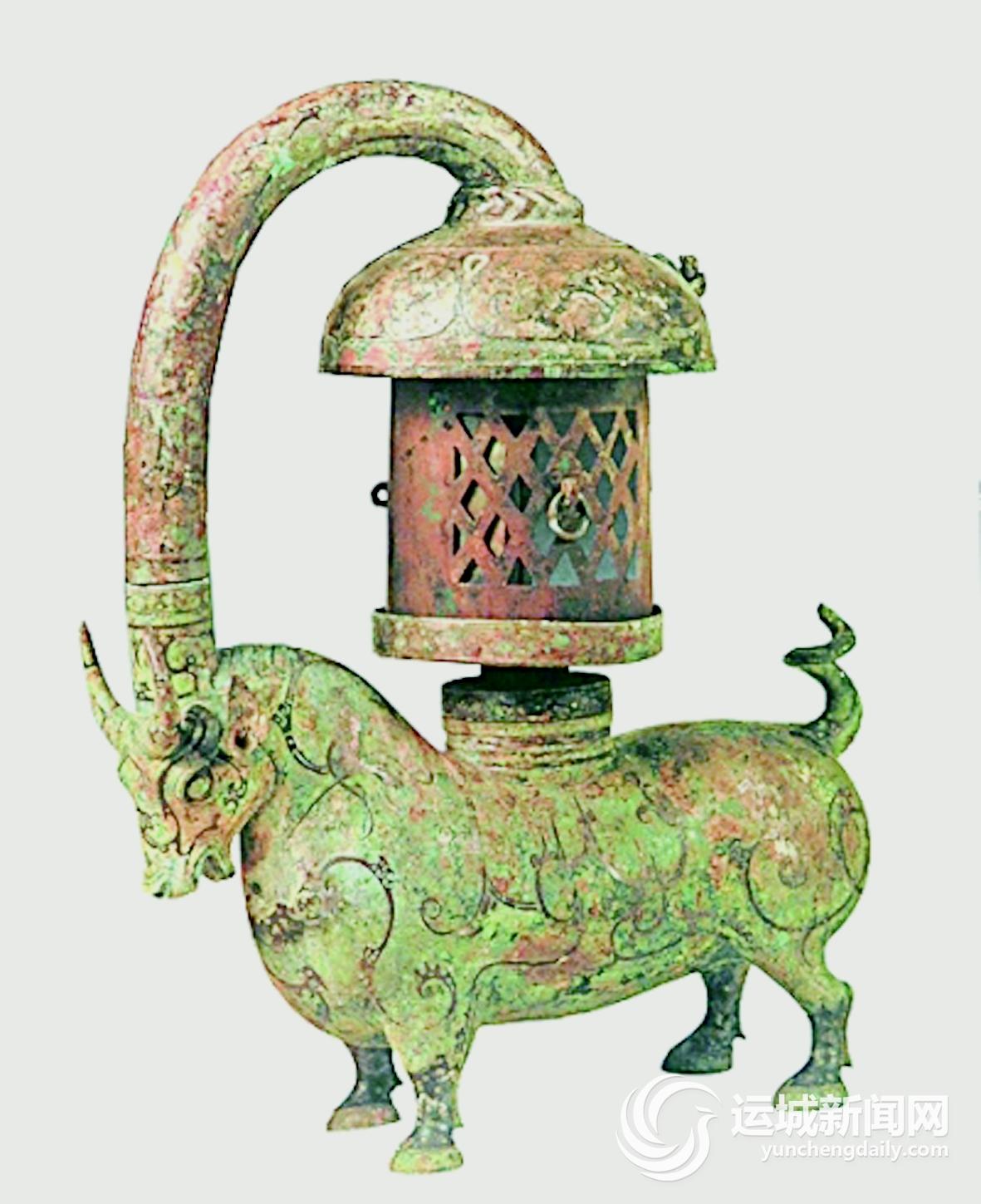“敕庙”铜牛灯,1949年出土于长沙。以牛为灯形,牛角中空,上与一带喇叭状罩的圆管互相扣合,喇叭口正对牛背上的灯盘,牛腹中空,可盛水。点灯时,烟可由罩口进入圆管由牛角处进入盛水的腹中。1975年,江苏睢宁出土“东汉云纹铜牛灯”,也是采用牛的造型。相对上面介绍的几种灯,扬州出土的东汉错银铜牛灯,做工更加精美。它同样由灯座、灯罩等部分组装而成,各部分都可拆卸以便移动和清洗。牛背上驮小圆亭形灯座,带短小把手的灯盘,两片弧形竖菱形镂空屏板构成灯罩,燃灯时金属屏板往往烫手,屏板上多设了个小纽环便于隔热拉动。镂空的菱形格状孔,具有散热和透光作用。