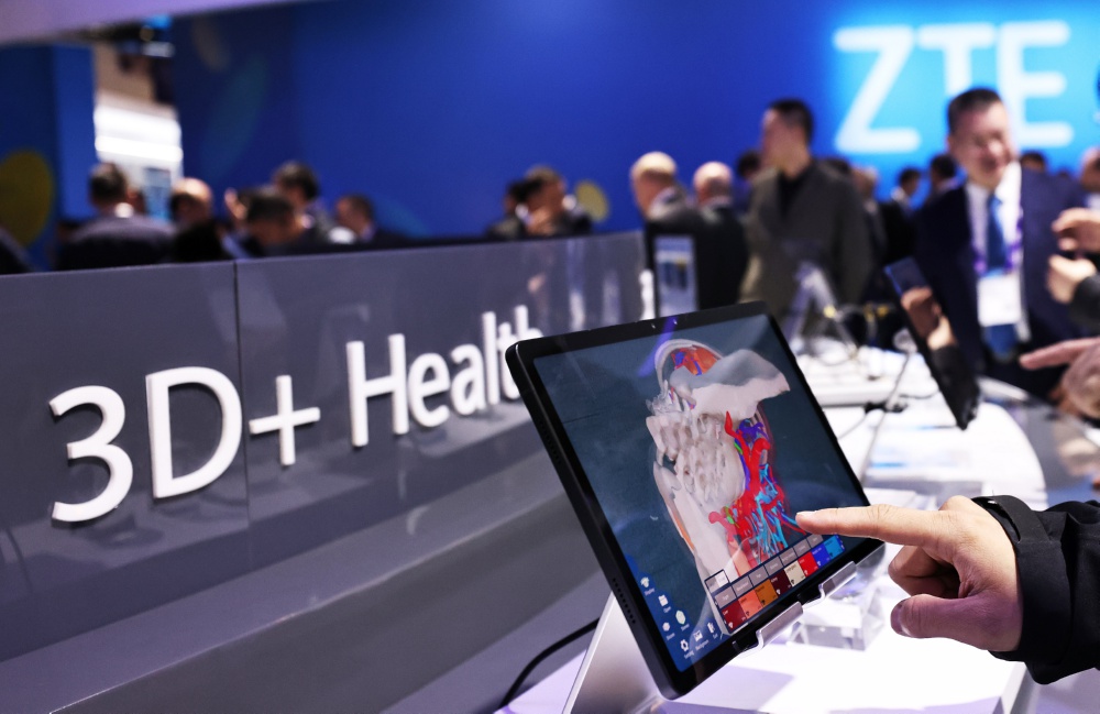 2月28日,在西班牙巴塞罗那举行的2024年世界移动通信大会上,一名参观者在中兴展台体验全新升级的努比亚5G+人工智能裸眼3D平板电脑。