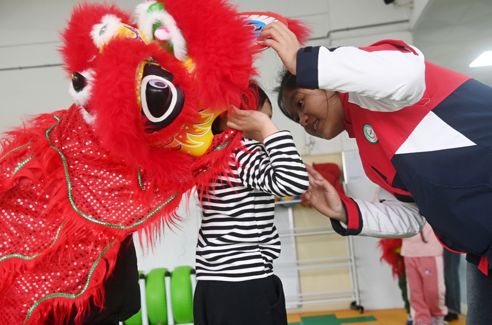 在广西壮族自治区听力言语康复中心,一名老师在和舞狮的孩子交流(2月28日摄)。