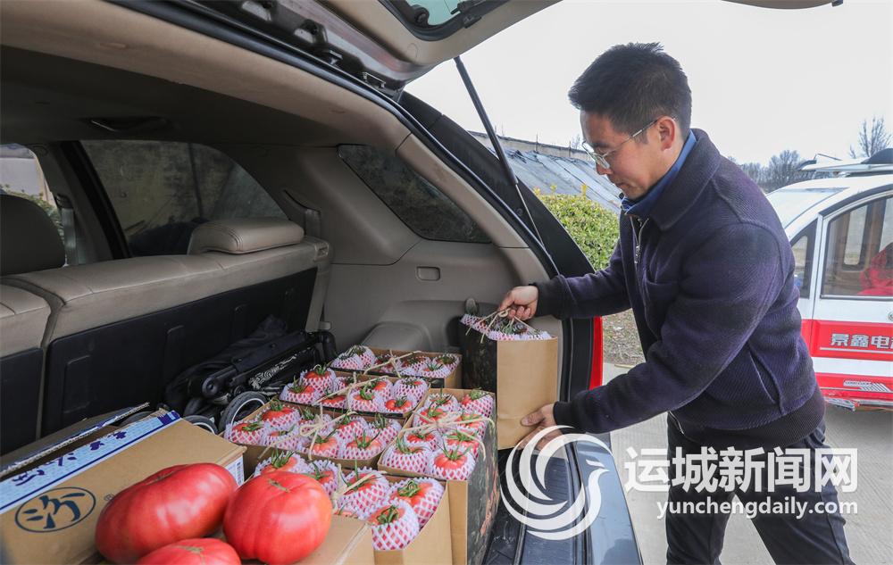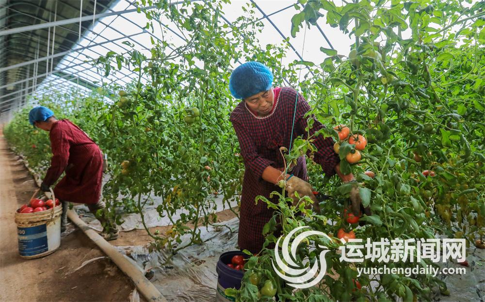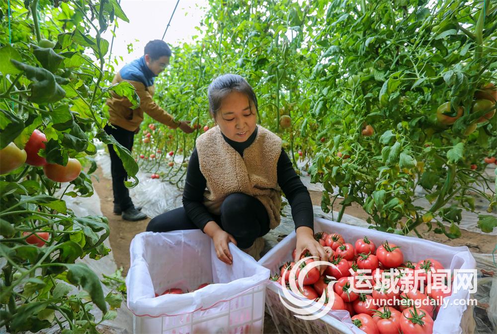 2月19日下午,在盐湖区北相镇运稷线边山西中药材集团运城基地最里处,35岁的于国锋和妻子马茜正在大棚里分拣打包采摘的西红柿。