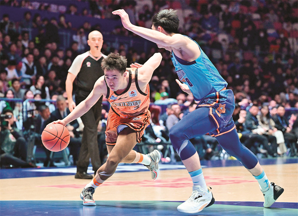 3月3日,北区明星队球员赵继伟(左)突破南区明星队球员崔永熙的防守。
