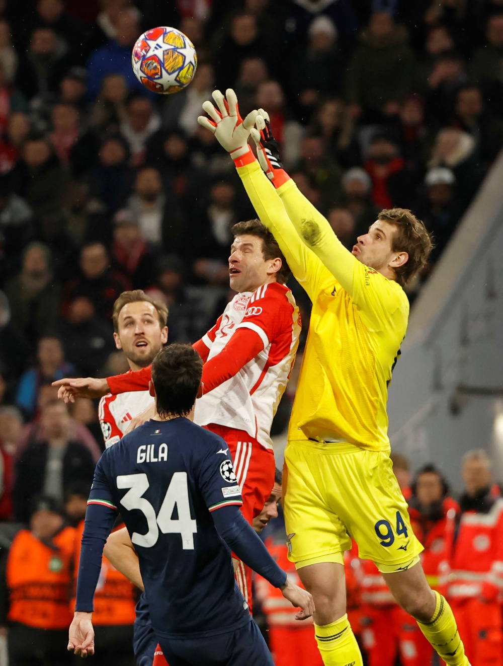 3月5日,拜仁慕尼黑队球员穆勒(右二)与拉齐奥队守门员普罗维德尔(右一)在比赛中拼抢。