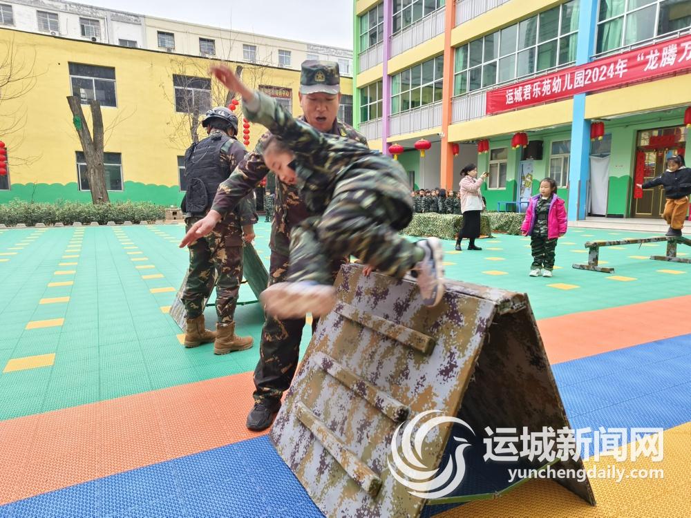 “萝卜教官真厉害,展示了这么多技能。”“听萝卜教官讲,有了军人叔叔站岗,才有了祖国的安宁和幸福的生活。”“萝卜教官太帅了,在他的带领下,我都能闯关了。”……3月4日,在市区君乐苑幼儿园内,山西视界行体能拓展有限公司的教官和孩子们共同参与幼儿军事综合障碍拓展活动,一堂生动的国防教育活动课正在上演,该公司的负责人卢波就是其中一名教官。“卢波”音似“萝卜”,孩子们就为卢波起了一个“萝卜教官”的可爱别名。
