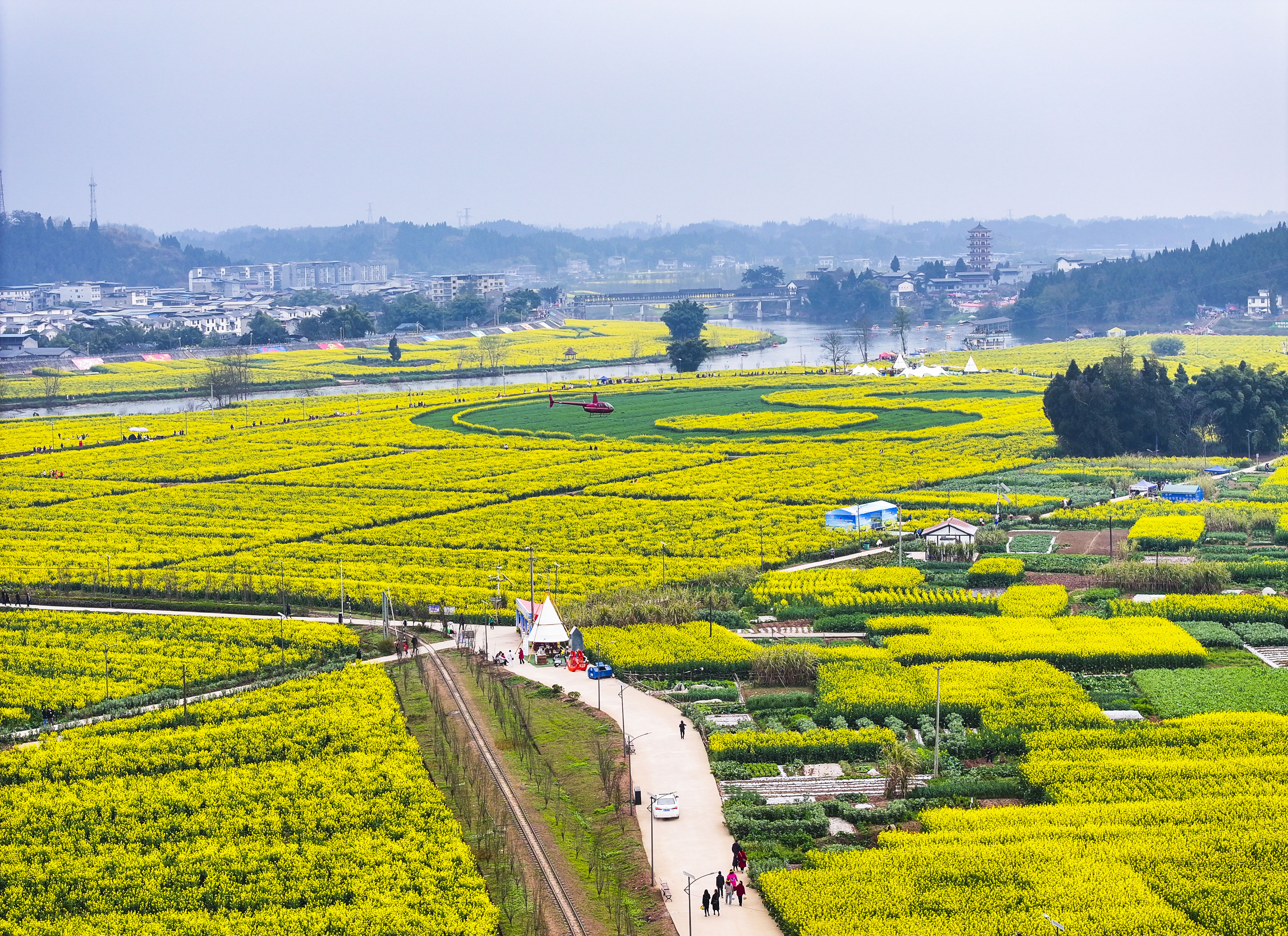 这是3月9日拍摄的重庆潼南崇龛花海景区景象(无人机照片)。 早春时节,重庆市潼南区30多万亩油菜花竞相绽放,秀美如画。潼南区粮油种植历史悠久,2022年被认定为“国家级油菜制种大县”。 近年来,潼南区依托“油菜花经济”,以花为媒,推进农业与旅游等产业融合发展,促进农民增收和乡村振兴。 新华社记者 王全超 摄
