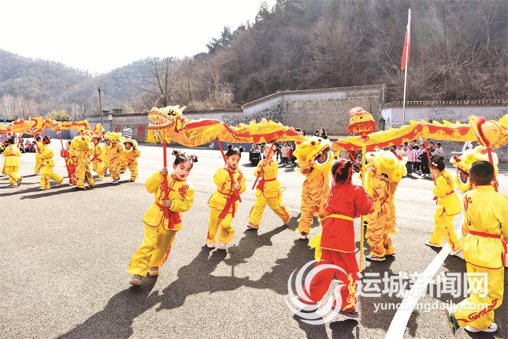 3月11日,垣曲县中心幼儿园的娃娃舞龙队,在胡家峪幼儿园表演舞龙。 当天是农历二月初二,该幼儿园组织孩子们来到30公里外的矿区幼儿园,通过介绍舞龙、表演舞龙、互动舞龙等,开展学前教育交流活动。 特约摄影 崔松良