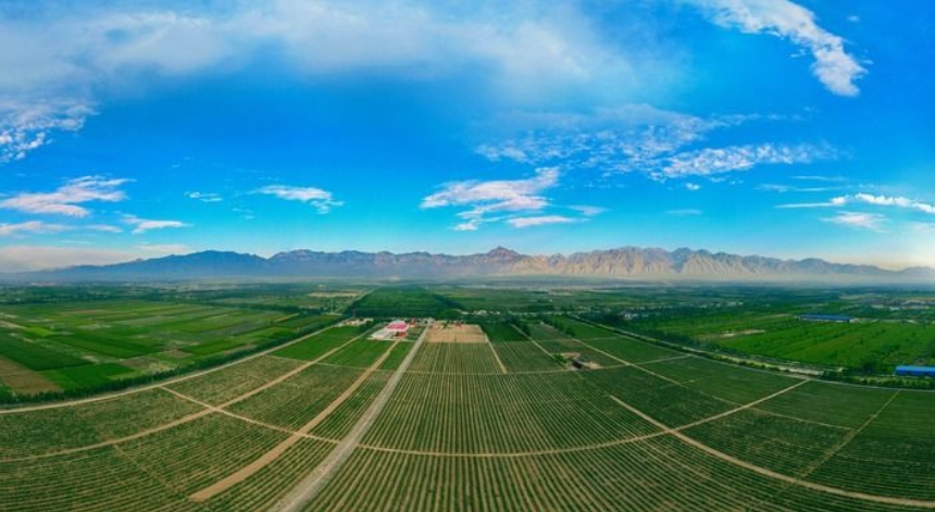 ——坑壑育新生、荒滩绿生金,是“两山”理论在西北地区的生动实践。不与人争粮、不与粮争地、水资源高效利用,是贺兰山东麓葡萄酒产业的典型特征之一,酿酒葡萄的种植促使荒滩变绿洲,产区森林覆盖率大幅提升;葡萄酒产业每年为产区周边农户提供就业岗位近13万个,酒庄(企业)年支付农户工资约10亿元,当地农民收入近三分之一来自葡萄酒产业。