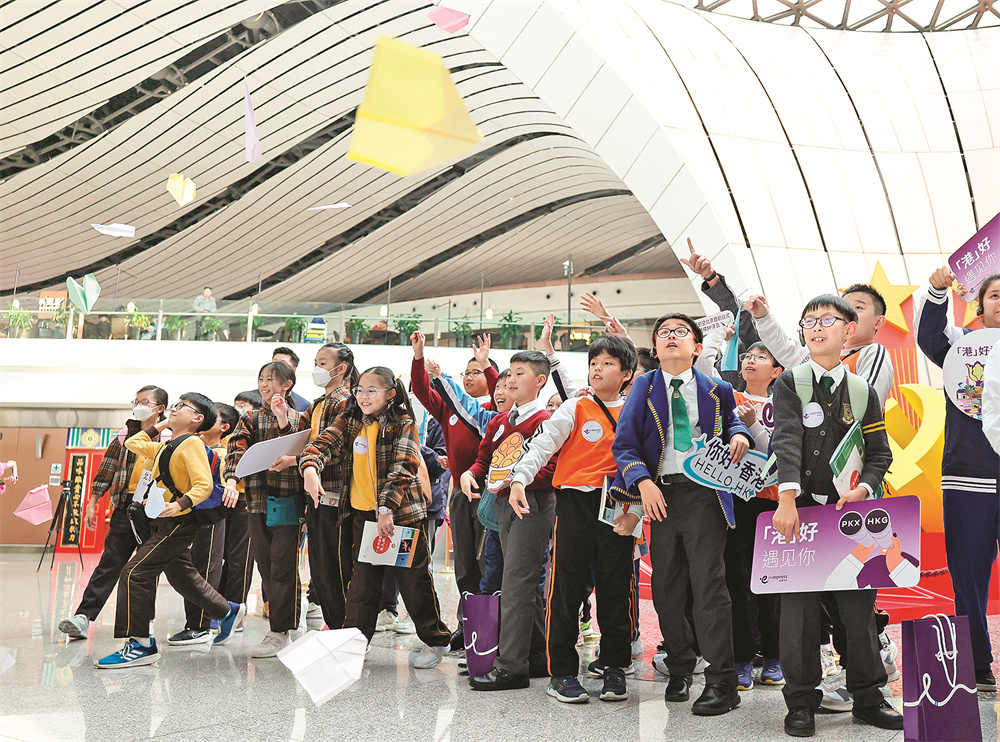 3月12日,搭乘香港快运航空首航航班抵京的香港中小学生参观团在大兴国际机场航站楼内参加活动。