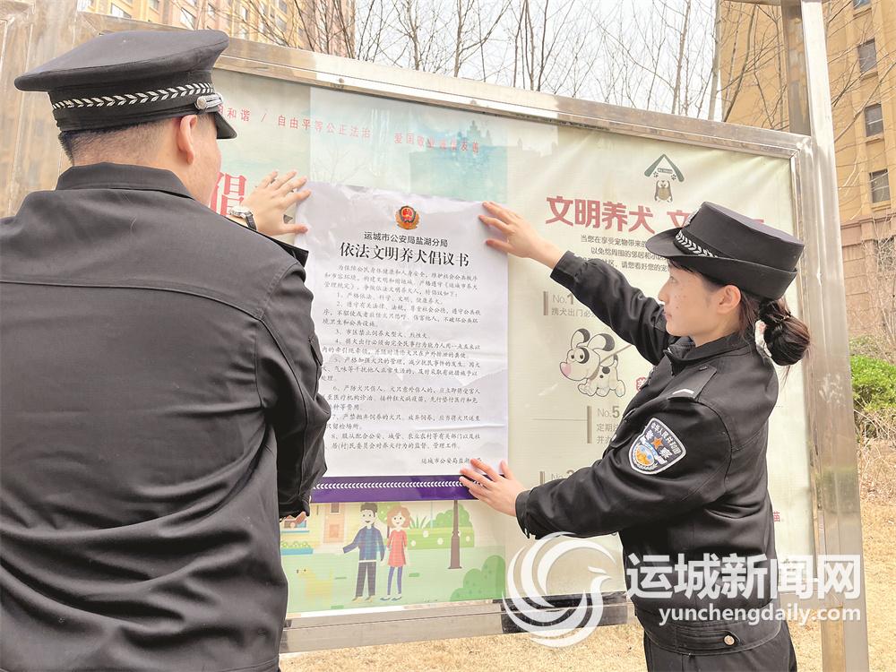 “您好,请记得将狗绳牵好,及时清理粪便。”“您好,这只狗狗办证了吗?”……3月13日,在信合名都社区,盐湖公安分局安邑派出所民辅警与社区工作人员在张贴文明养犬倡议书后,向居民们发放了养犬法规宣传单,提醒居民携犬出门时要拴好牵引绳并妥善处理粪便,做到文明养犬、规范养犬。