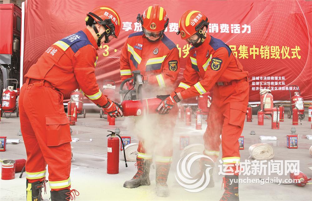 3月15日,市消防救援支队消防员在市区南风广场集中销毁假冒伪劣消防产品。