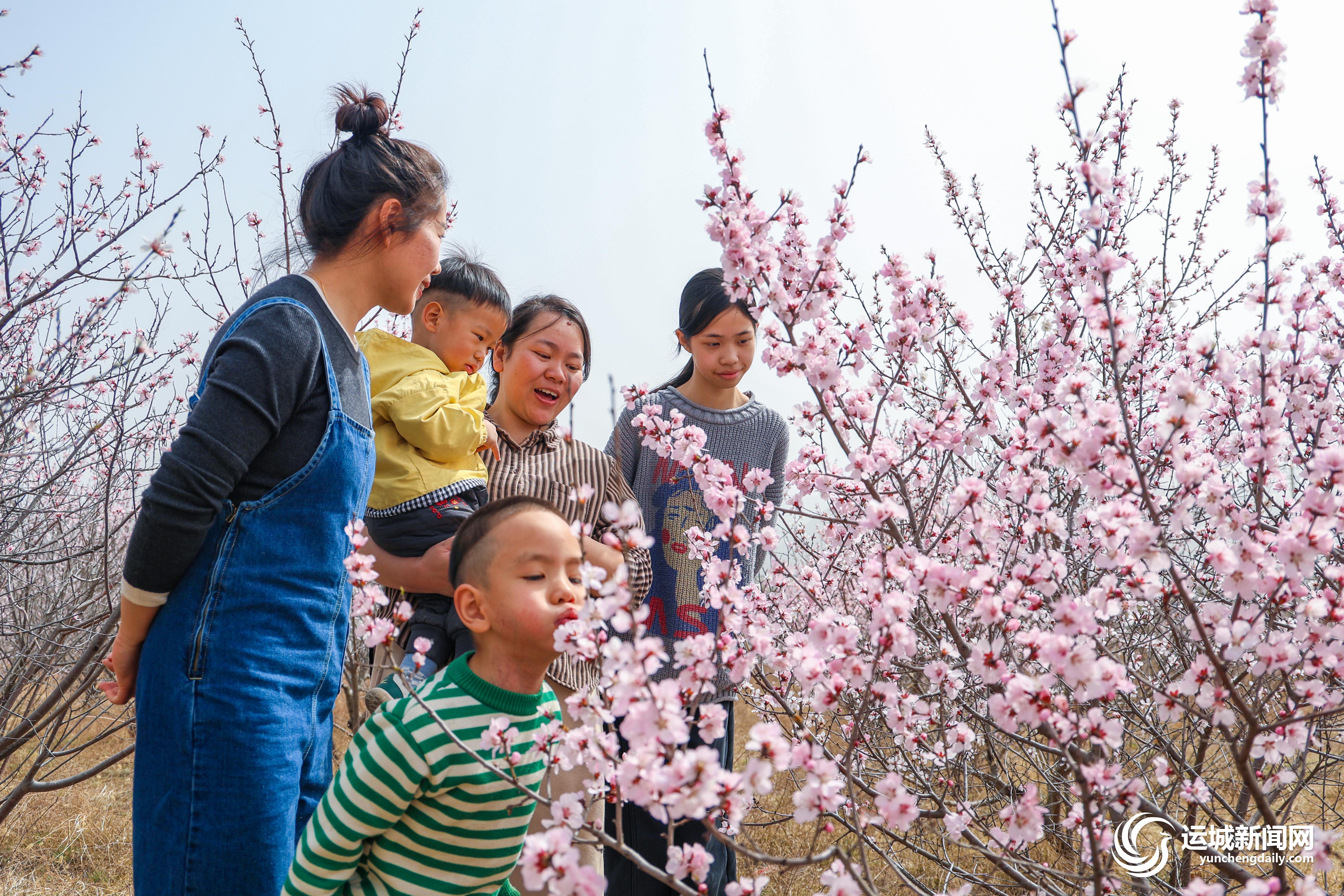 3月16日,市民在运城盐湖附近的杏树林里踏春赏花。