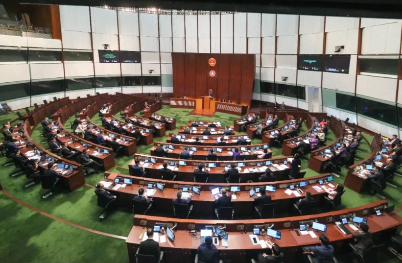 3月19日,香港特区立法会加开会议恢复二读辩论《维护国家安全条例草案》。图为立法会会议现场。中新社记者 陈永诺 摄