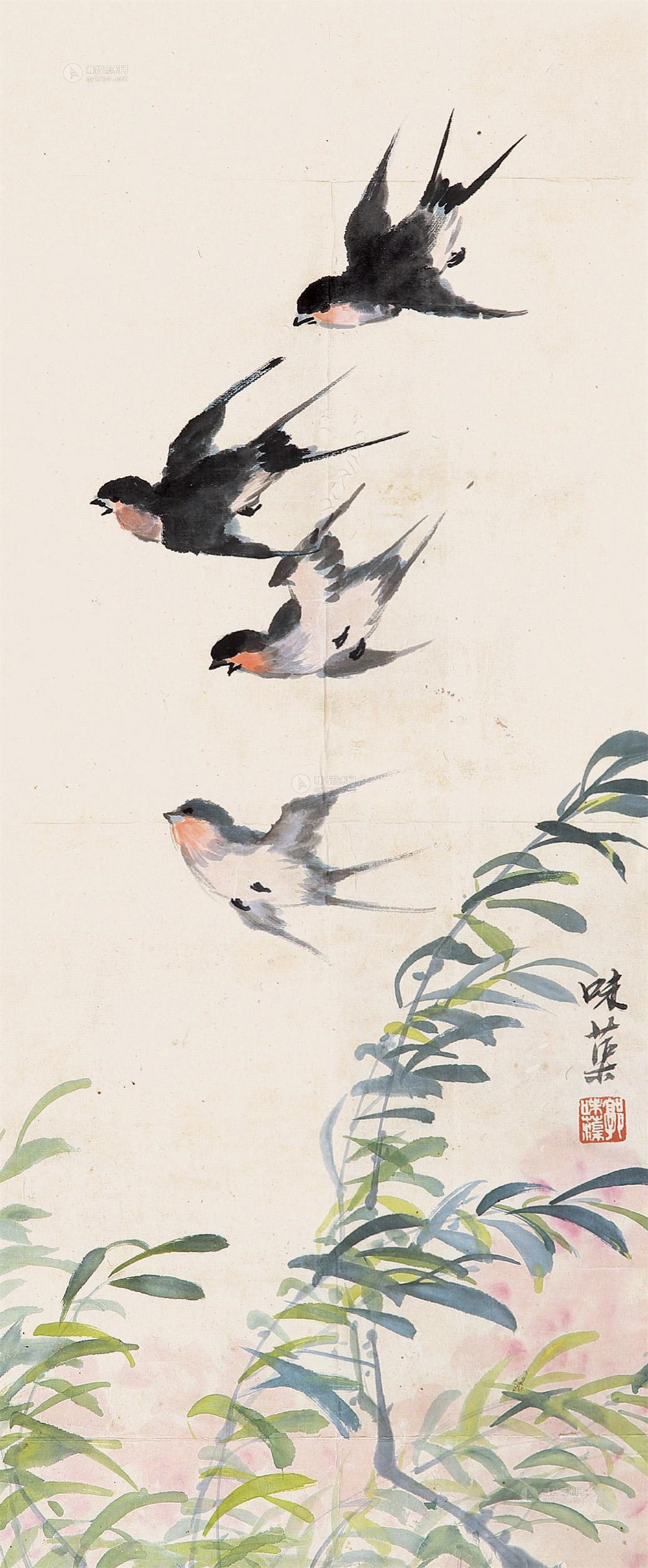 郭味蕖画作《花鸟燕子柳枝》