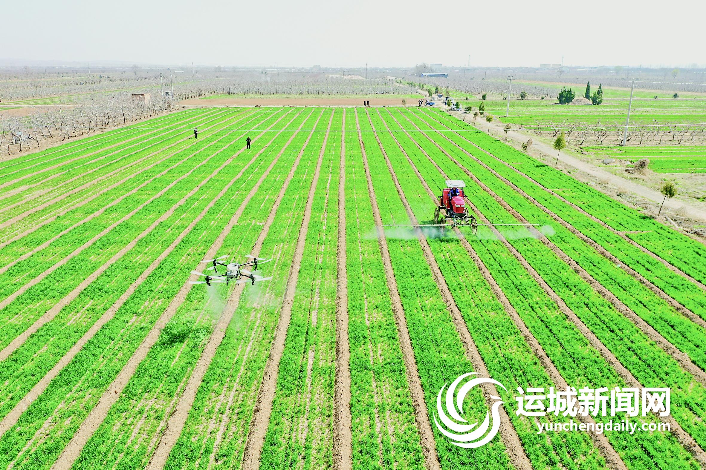 3月20日,盐湖区上郭乡南陈村村民操作植保机在进行小麦春管作业。
