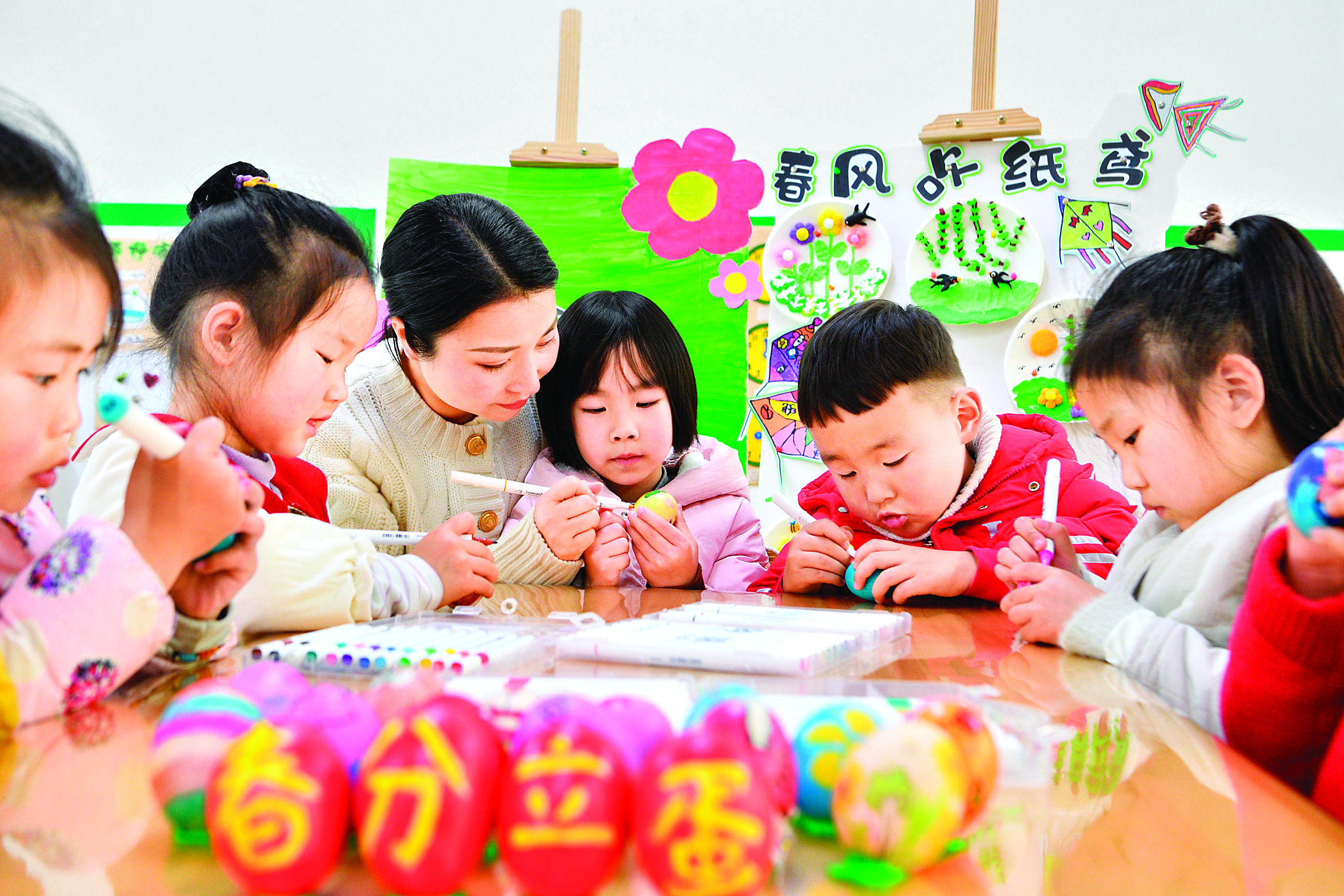 3月19日,在湖北省襄阳市保康县一家幼儿园,老师指导小朋友绘制彩蛋。