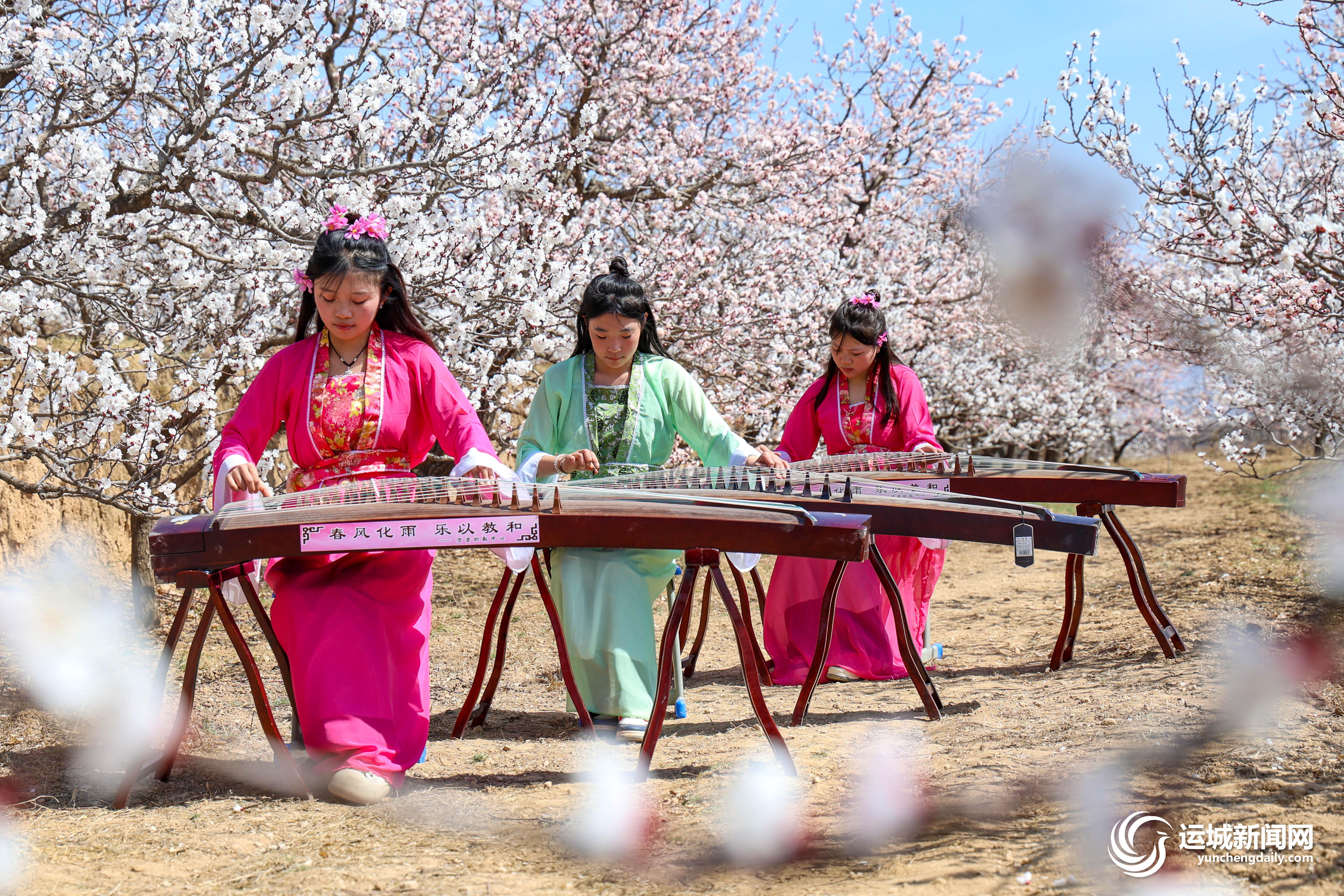 杏花深处,有人着古装、化淡妆翩翩起舞,有人直播解说、寻景拍照。花海里,不见人影,但闻古筝声声,似深谷幽兰、小桥流水,又恰似那满树杏花的缤纷。