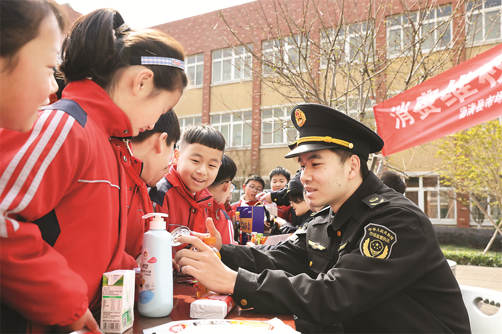 3月13日,在浙江省湖州市德清县乾元镇中心小学,市场监管执法人员向学生们传授如何辨识消费品。 新华社发(倪立芳 摄)