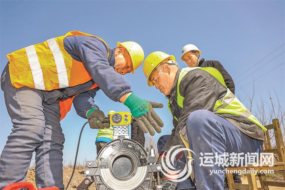 3月20日,在平陆县张店镇的新建水浇地项目施工现场,工人在焊接管道。该项目受益耕地面积达6.89万亩。 特约摄影 权永军 摄