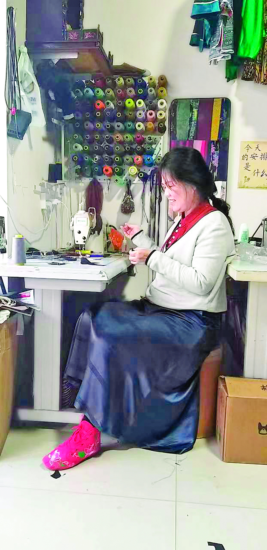 门的西侧墙上挂着整齐的彩线,天然成为一幅锦绣画,门的东侧墙和北侧墙上则是各色的绸缎、香云纱和纯棉布料。如云似霞,艳丽饱满。