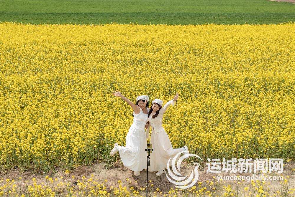 一边是巍巍中条,一边是七彩盐湖,湖边的油菜花田仿佛是镶嵌其间的一块块黄色宝石,绿油油的春日麦田仿若翡翠,灿灿的黄、茵茵的绿,勾勒出春日里最美妙的画卷。游客或是踩着自行车享受轻松惬意,或是徜徉花海拍照留念……游走其中,能闻到油菜花的清香、泥土的清新。